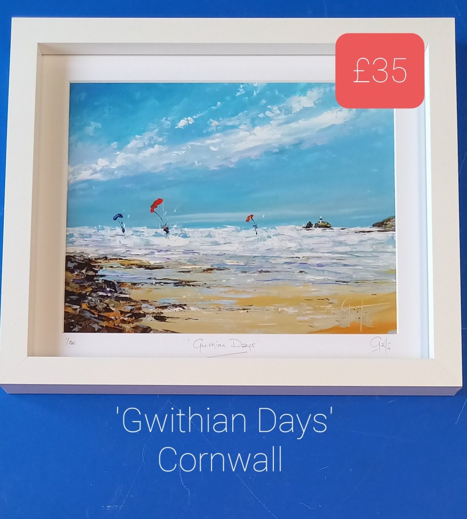 ‘Kitesurfers at Gwithian Sands’ Limited Edition Prints from an original oil painting by Gail Morris £38 https://gail-morris-art.square.site/product/kitesurfers-at-gwithian-sands-cornwall-framed-print/147 and larger print £70 – £85 https://gail-morris-art.square.site/product/kitesurfers-at-gwithian-sands-larger-framed-print/148