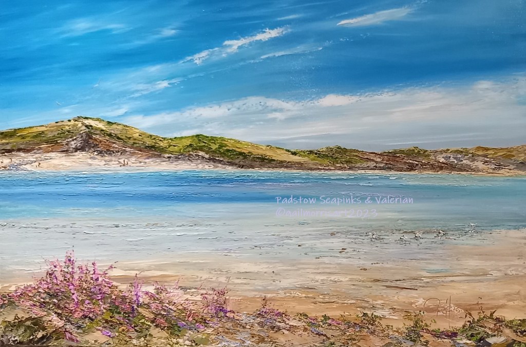 ‘Rock towards Stepper Point’ – depicts the beautiful Camel Estuary across to Padstow from Rock. Wild Valerian and Evening Primrose in the foreground. Framed Prints available in three sizes : £38, £90 https://gail-morris-art.square.site/product/padstow-rock-stepperpoint-camel-estuary-framed-print/98