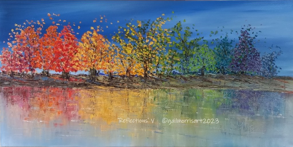 I am happy to say that my latest ‘Reflections’ series 5 is now available. Painted on a large canvas block panel, this colourful oil painting is ready to hang direct onto your wall, with a signed certificate of authenticity on the back.