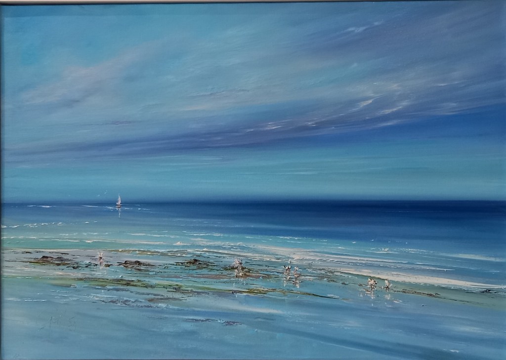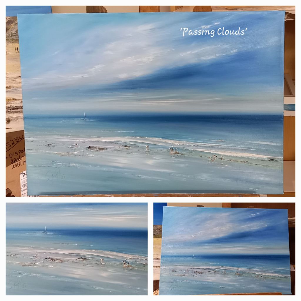 ‘Passing Clouds at Teignmouth’, Devon – original oil painting on canvas within a St Ives style gallery frame approx 31″ x 24″ – ready to hang. £595
