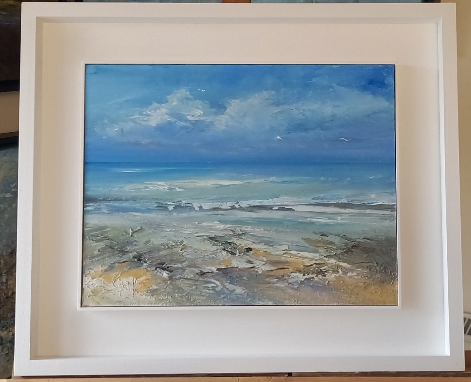 New oil and mixed media seascape with a contemporary white St Ives style gallery frame 25″ x 21″ £345