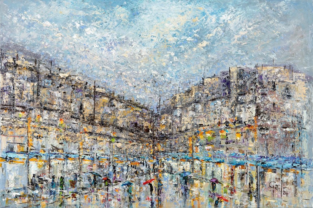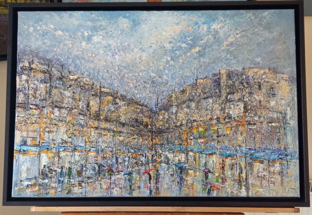 Original oil painting with heavy impasto technique for extra detail and interest. Capturing the iconic scene from a wet afternoon with colourful umbrellas and busy shoppers. Each one of these little characters has a fascinating story to tell you.
