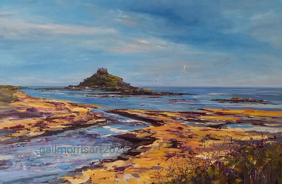 St Michael’s Mount from Long Rock Beach, Marazion, Cornwall Original Oil/Mixed media painting on a large canvas panel with contemporary black frame. UPDATE NOW SOLD