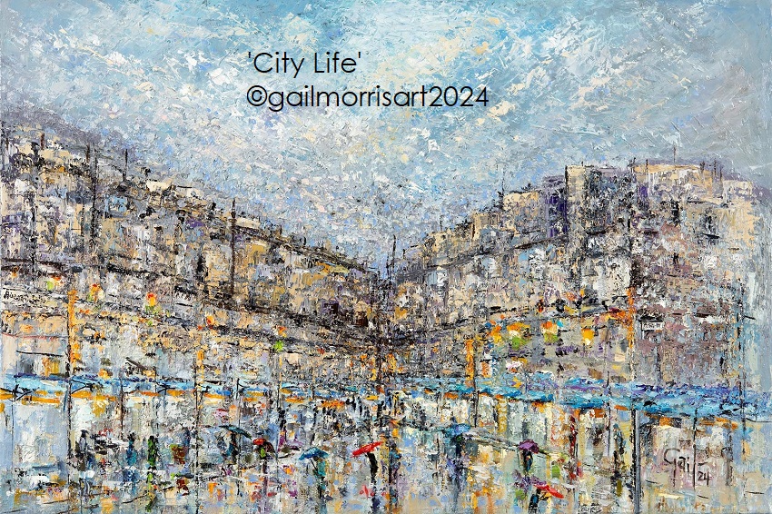 Vibrant energy of ‘City Life’ where umbrellas dot the busy high street, capturing the essence of urban living. Original oil on canvas block panel with a black tray frame 810 x 560 x 40mm SOLD
