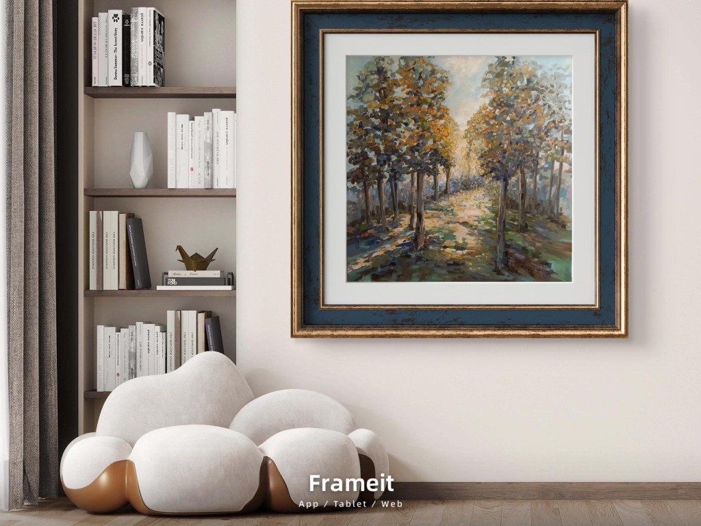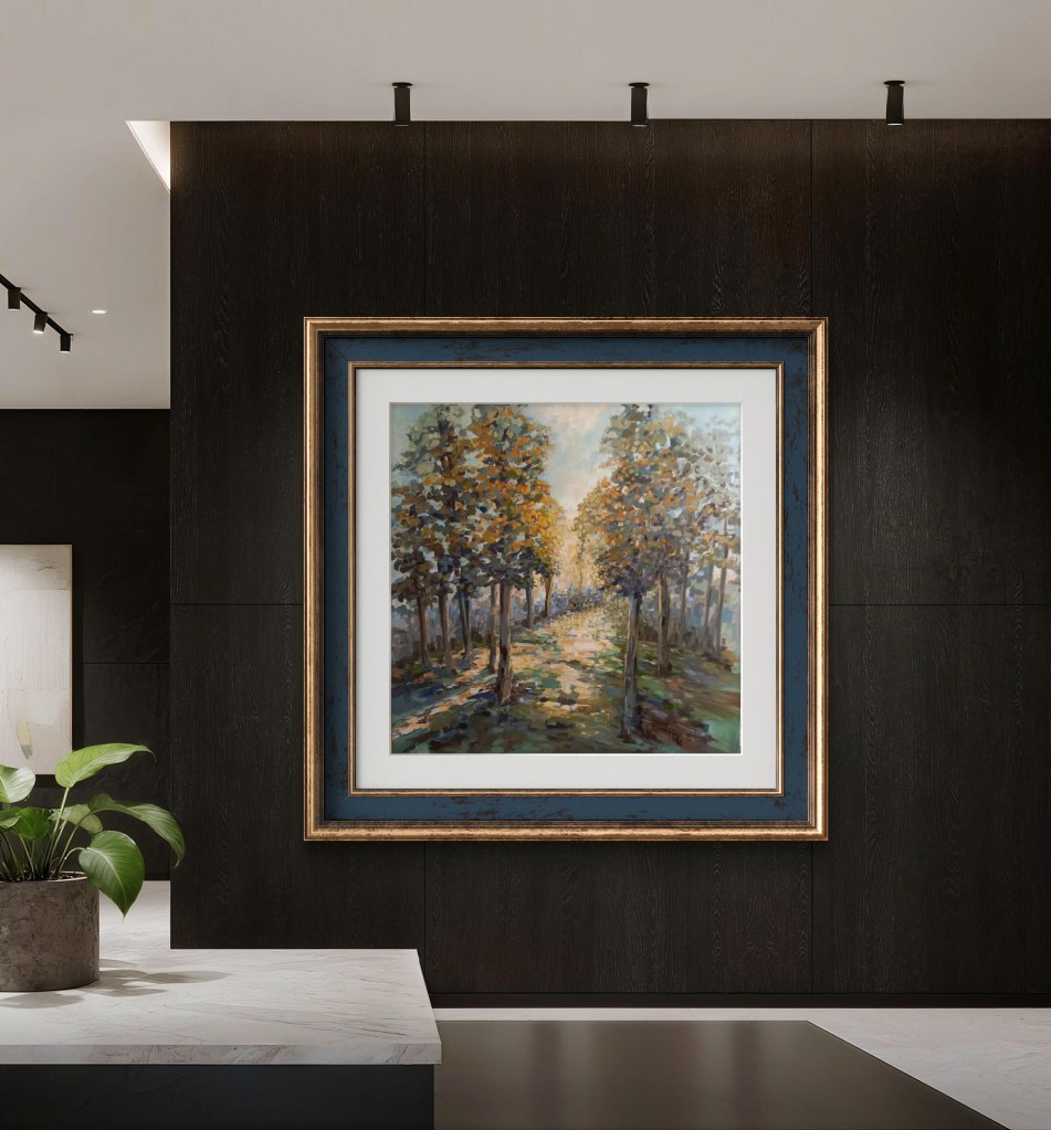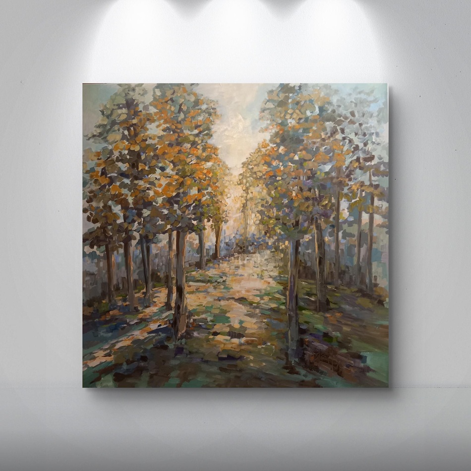This evocative oil painting captures the calming dappled sunlight falling onto a beautiful pathway. The painting uses grounding earth tones throughout. This allows the viewer to take a very special moment. It helps in feeling the beauty of being at one with our surroundings.