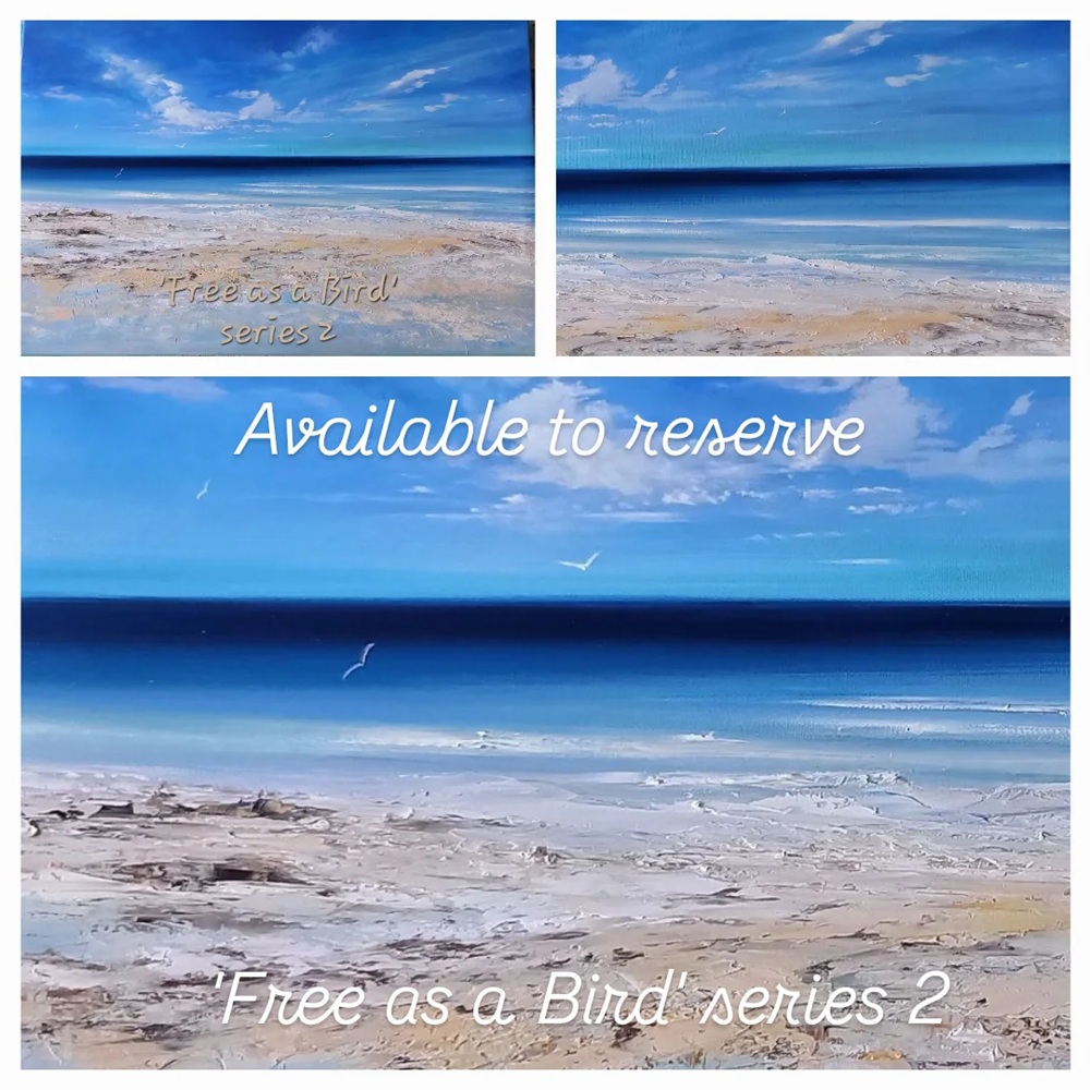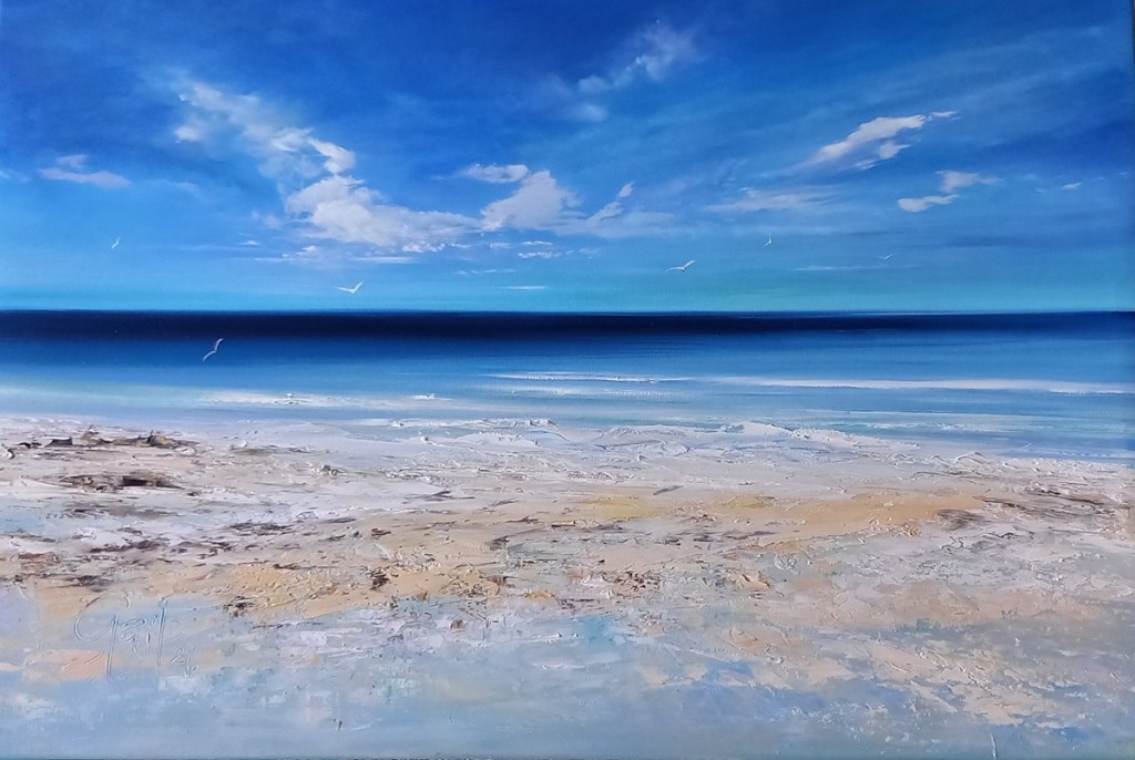 Introducing my new oil paintings for April 2026 – which have an appeal to those looking for contemporary seascapes with an air of freedom and tranquility. Each painting measures 60cm x 40cm (canvas block panel) and is sold ready to hang. Price £345